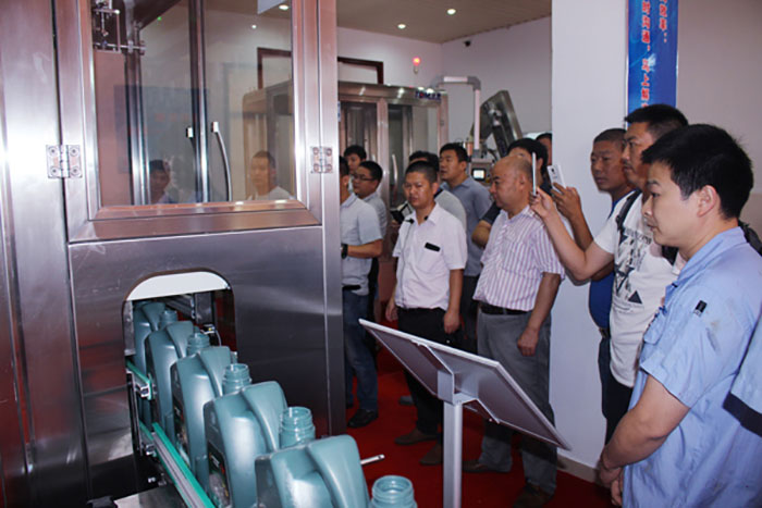 接著各位領(lǐng)導(dǎo)參觀了湯姆集團(tuán)三樓會議室及接待廳,古色古香的接待廳和多功能現(xiàn)代化的會議室受到了參觀人員的一致好評。參觀完接待廳,隨后各位領(lǐng)導(dǎo)參觀了湯姆集團(tuán)樣機(jī)室,1-4L的生產(chǎn)流水線,20L的生產(chǎn)流水線,全自動稱重式灌裝旋蓋一體機(jī),流水線從理瓶、灌裝、旋蓋、貼標(biāo)、裝箱、封箱、碼垛全方位的向各位領(lǐng)導(dǎo)展示了湯姆集團(tuán)設(shè)備的優(yōu)秀性能。大氣的外觀、優(yōu)秀的性能、人性化的設(shè)計獲得了參觀領(lǐng)導(dǎo)的一致好評,紛紛表示希望能和湯姆合作。董事長湯建華陪同各位領(lǐng)導(dǎo)參觀了湯姆集團(tuán)的生產(chǎn)基地,從到原材料倉庫、精加工車間、焊接拋光車間到裝配等車間,期間董事長湯建華和各銷售人員詳細(xì)的向各位領(lǐng)導(dǎo)介紹了各車間的工況。明亮整潔的車間,有條不紊的湯姆員工獲得了各位參觀領(lǐng)導(dǎo)的大力贊賞,并強(qiáng)調(diào)只有好的工作環(huán)境和認(rèn)真有序的員工才能生產(chǎn)出好的設(shè)備,我們才能買的放心,用的放心!